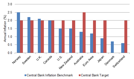 The world generally is awash in low inflation. Among the largest developed economies, only Norway, Sweden and the UK have inflation above the central bank target (Exhibit 2). Canada is at target. And the US, euro area and Japan, among others are below target.