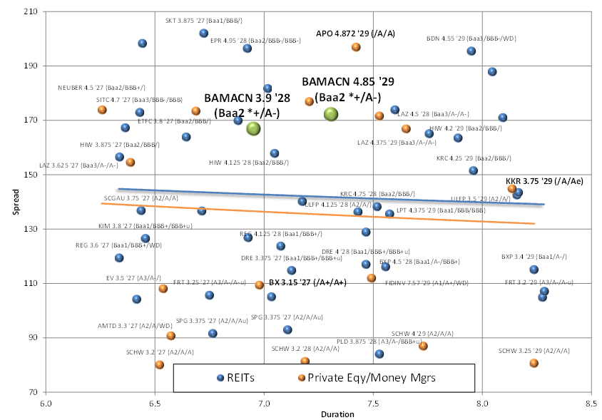 Brookfield Asset Management (BAMACN) 10-year paper is offering a nice pick to both investment grade private equity/investment management credits and REITs. While the company is not a REIT, its ownership of Brookfield Property Partners LP (BRY)—which contains REIT operating subs—makes up a large portion of dividend income. Therefore, bonds should also be compared to REITs, specifically those in the office and retail segments. The BAMACN 3.9% 01/25/28 is currently trading in a +160-155 context, or about +165 to the curve, for a total yield of around 3.60%. The BAMACN 10-year paper could tighten by up to 15 bp on closing of the Oaktree acquisition and the potential ratings upgrade by Moody’s.