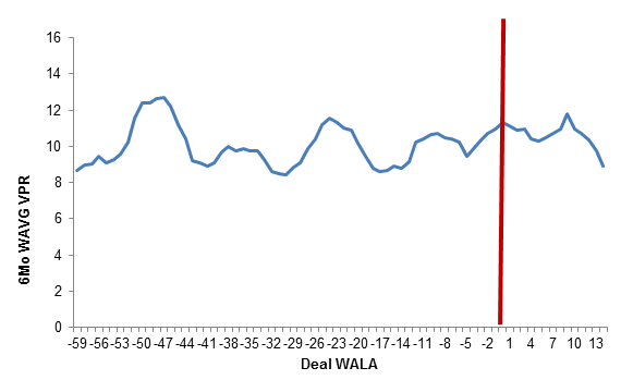Although NRZ and other legacy loans may be newly re-securitized, tracing the loans back to their former lives in legacy trusts shows both pre- and post-issuance performance through a number of refinancing waves. NRZT 2018-1A, for example, has only 14 months of prepay history. The WALA on the collateral, however, is 140 months. The longer pre-securitization prepayment rate is calculated using weighted average historical prepayment rates on the always performing and re-performing loans in the called legacy deals collateralizing the NRZT trust (Exhibit 2).