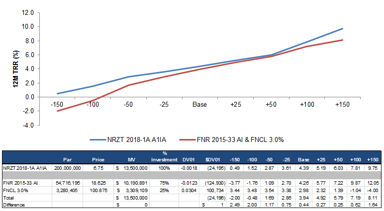 The NRZT ‘AAA’ IO compares favorably to a comparable agency IO. Comparing the NRZT IO to a seasoned higher coupon agency IO like FNR 2015-33 AI, a 5% IO backed by 5.49% WAC, 190 WALA Fannie Mae 5.0% collateral is a reasonable albeit imperfect comparison. The Fannie bond has a much lower WAC and is more seasoned than the NRZT bond. The bonds trade to roughly comparable IO multiples with the Fannie IO trading at roughly a 3.7 times coupon multiple. The Fannie Mae IO has significantly more negative duration given the fact it is a true pass-through strip and the cash flow can extend more into a back-up in rates. Pairing the Fannie Mae IO with TBA FNCL 3.0% leaves it duration-neutral to the NRZT IO. The NRZT IO still outperforms the combination of agency IO and TBA by a projected 44 bp in the base case. As rates shift, the NRZT IO significantly outperforms the combo by as much as 249 bp given the far more stable collateral. (Exhibit 4)