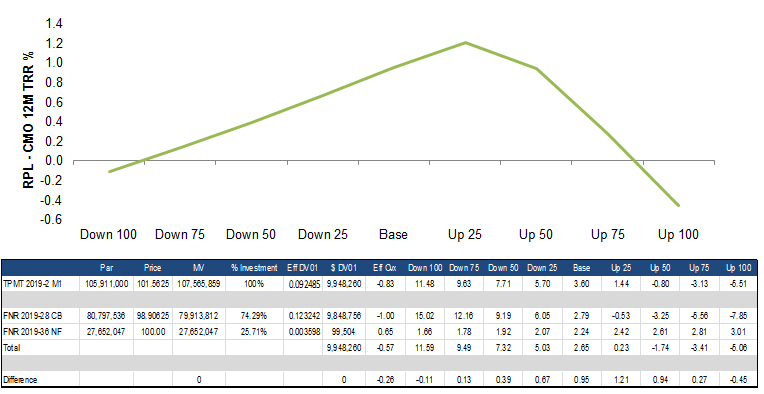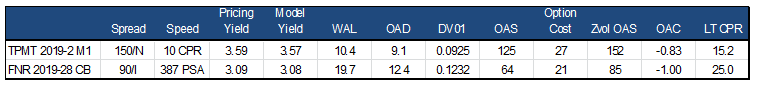 The TPMT bond compares favorably to LCF agency CMOs like FNR 2019-28 CB as it offers 55 bp more nominal spread and an additional 60 bp of OAS than the agency LCF (Exhibit 2). The bond is roughly three years shorter in duration than the LCF, partially driven by the fact that the TPMT bond is a premium with 75 bps more coupon than the LCF. Despite the greater amount of IO in the TPMT bond, it has better convexity than the agency CMO. And despite comparable WACs, the TPMT bond is expected to pay roughly 10 CPR slower than the agency LCF, likely a function of the large amount of securitized forbearance.