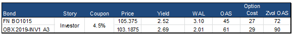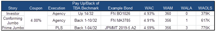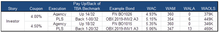 While there are structural differences between the investor pass-through and the agency pool, the collateral profiles are substantially similar given that these are agency-eligible investor loans that had better private label execution relative to an agency guarantee fee and associated loan level pricing adjustments. As such the nominal cheapness in the investor 4.5% equates to an additional 16 bp of OAS on the investor pass-through despite the more levered cash flow structure. (Exhibit 2)