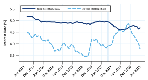 The fixed-rate HECM borrowers, in theory, should refinance if interest rates fall. However, the rates offered to these borrowers have been very stable throughout the life of the program and show little correlation to other interest rates.