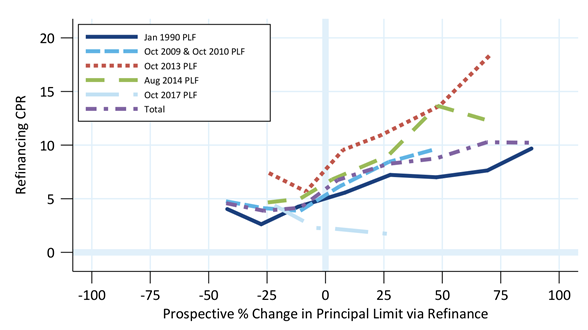 For each loan, an estimate is made of the borrowing capacity of the new loan. This depends on estimated home price appreciation using Case-Shiller’s home price index, current interest rates, the current age of the younger borrower on the loan, and the PLF tables in force at the time. The x-axis is the percentage increase or decrease relative to the current loan amount. The y-axis is the prepayment rate due to refinancing; Ginnie Mae discloses a variety of payoff reasons for HECMs, which makes it possible to differentiate refinances from other prepayments.