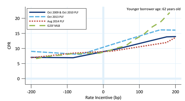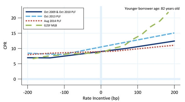 A loan to an 82 year old borrower that prepays similarly to the October 2013 PLF cohort and had 200 basis points rate incentive would only prepay at 15 CPR, while a 62 year old borrower might prepay at 16 to 17 CPR. Both are well below expected speeds on a 30-year MLB pool with the same rate incentive.