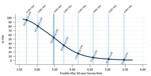 Exhibit 1: % of MBS that are in-the-money for various 10-year Treasury rates