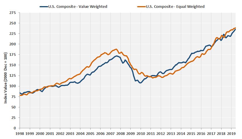 Note: In the equal-weighted index every transaction is treated equally regardless of the value of the transaction. The resulting index is an equal weighted, geometric mean index. The value-weighted index weighs the price change from one sale to the next by the value of each transaction, resulting in a value-weighted, arithmetic mean index. Data through June 2019. Source: CoStar Commercial Repeat-Sale Indices (CCRSI).