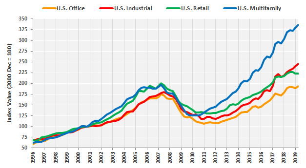 The benefit of both CoStar and Green Street indices is that they track price appreciation across the various CRE segments (Exhibit 3 and Exhibit 4). Multifamily CRE price appreciation has outpaced other sectors, benefiting post-crisis from the increase in demand from millenials who so far prefer renting to owning homes. Rent growth in multifamily has also been strong, possibly exacerbated by an ongoing inventory shortage of affordable single family homes. Both trends have contributed to strong price appreciation of multifamily properties.
