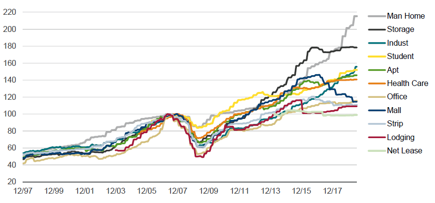 Green Street tracks CRE prices across finer property segments (Exhibit 4). This level of detail can be particularly useful for conduit CMBS investors that want to evaluate CRE price trends in e.g. lodging, self-storage, or student housing specifically, perhaps because a deal has significant exposure to that segment. This data also uncovers the recent price depreciation in shopping malls, and dramatic increase in manufactured homes that could be driving some of the overall increase in the multifamily sector.