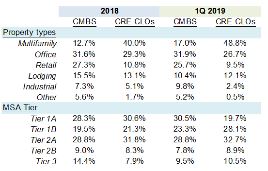 CRE CLO asset pools tend to be geographically diverse, similar to those in conduit CMBS, though multifamily properties comprise on average 40% of collateral in 2018 vintage deals compared to 13% of non-agency CMBS (Exhibit 1). Retail properties are also less frequent in CRE CLOs, making up on average only 10% of the collateral over the past five quarters compared to being 25% of that underlying CMBS.