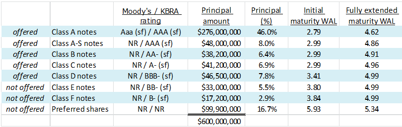Virtually all CRE CLOs have the Class A notes rated by Moody’s, and most have the Class A through Class F notes rated by Kroll Bond Rating Agency (KBRA). The notes rated investment grade are the notes offered for sale, those rated below investment grade and the preferred shares (which are not rated) are not offered. An example of a typical CRE CLO deal structure is shown in Exhibit 3.
