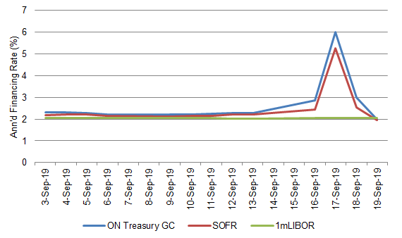 The market has a host of theories about why demand to borrow money overnight suddenly outstripped supply on September 17. Treasury repo and SOFR, which is calculated from Treasury repo rates, both spiked while 1-month LIBOR moved by 2 bp (Exhibit 1). The LIBOR market, looking ahead for 30 days, clearly thought the spike would not last.