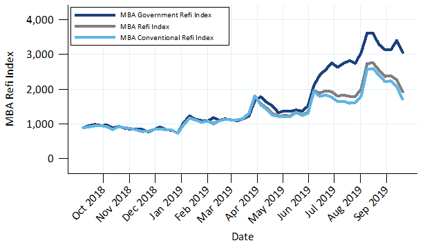 The MBA’s overall index, the conventional index, and the government index tell different stories (Exhibit 1). Prior to the summer refinance wave, all three indices tracked very closely. But the government index increased much earlier than the conventional index when rates dropped in late May. And the government index has not fallen nearly as much as the conventional index.