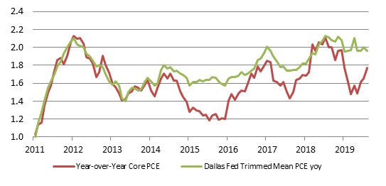 This approach systematically eliminates the sort of special factors that have from time to time distorted the core PCE deflator, including examples like the steep plunge in cell phone services in 2017 and the drop in apparel prices in March and April of this year. When the core PCE deflator and the Dallas Fed trimmed mean gauge diverge, it means that a handful of outliers are driving the core measure either up or down. This has occurred several times in recent years, including in early 2019 (Exhibit 1).