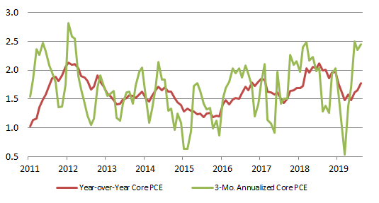 Another way of thinking about the year-over-year measure is to recognize that it consists of the sum of the last 12 monthly readings. For each successive month, there is one new observation, replacing the year-ago month that drops out of the 12-month window. It is possible to have an early read on movements in the year-over-year measure, especially when there are unusually high or low monthly readings dropping out of the 12-month window. For example, the core PCE deflator posted a meager 0.02% rise in August 2018. Thus, even with a pretty pedestrian 0.14% advance for August 2019, the year-over-year advance accelerated by more than full tenth, from 1.65% to 1.77%. The last four monthly readings of 2018 were all between 0.14% and 0.19%, so the swings in the year-over-year advance should be relatively modest through the end of this year. I expect a gradual pickup, but the 12-month advance is likely to inch upward rather than jump, as it did in August.