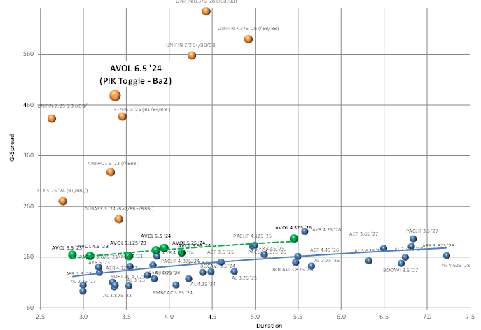 There is a unique opportunity in the market – a recent structured new issue from Avolon Holdings Ltd. that boasts IG credit with HY structure. The issuer is Global Air Lease Co. Ltd (GALC; new entity within Avolon Holdings Ltd), AVOL 6.50% 9/15/24 (5NC2, CUSIP: 37960JAA6) that has a senior AVOL rating of Baa3/BBB-/BBB- and a GLAC rating of Ba2/NR/NR. The 6.50% coupon has a PIK rate of 7.25%. AVOL 5NC2 PIK Toggle notes trade at roughly +450-500 bp to the curve, in-line with true HY issuers in the aircraft and commercial finance space (Exhibit 3).