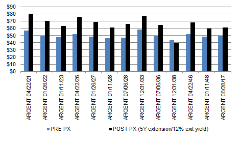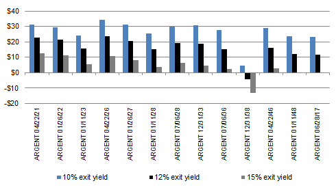 If we run a simulation of a Uruguay-style 5-year maturity extension on the Eurobonds, then the simple interpretation reaffirms the outperformance of the higher coupon and shorter tenor bonds (Exhibit 1). The initial guidance was for a 4-year extension up through 10-year maturities, but it’s unclear how to legally selectively default for cross default clauses. The negative interest rate environment offers a unique opportunity, with conservative exit yield scenarios (10%-15%) still offering potential for mark-to-market gains (Exhibit 2). The most conservative exit yields of 15% would still offer significant upside, ranging from 5%-22% capital returns from current dirty prices.