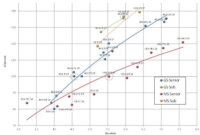 Overall investors should focus on the additional spread available in GS longer-dated intermediates; better opportunities are available along the curve in MS 4.35 ’26 (subs), GS 3.5 ’25 (seniors), and MS 3.875 ’26 (seniors) (Exhibit 2).