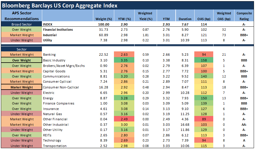 Note: Sector recommendations are made on an excess return basis (total return net of commensurate US Treasury return). The recommendations serve as a proxy for how portfolio managers should position their holdings relative to the broad IG corporate bond market. Source: Bloomberg Barclays US Corp Index