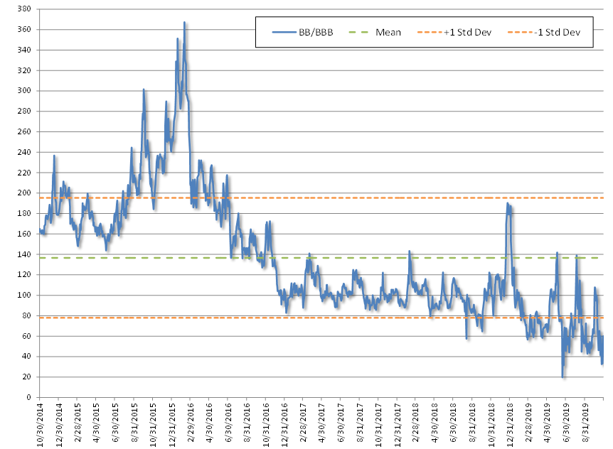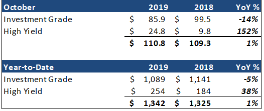 USD IG supply dropped -14% year-over-year to $86 billion in October, as new issue severely tempered from early September’s record-setting pace. Nevertheless, the performance versus 2018 hardly represents a major drop-off in activity, as Oct ’18 included a one-time, massive $27 billion 12-part new issue from Comcast (CMCSA), which was funding its $36 billion deal for Sky at the time. CMCSA was also among this month’s biggest issuers, but no IG credits brought jumbo deals in October, and only one issuance (WFC post-earnings) even surpassed the $5 billion mark. High yield provided an extremely impressive $25 billion in USD October supply, more than triple last year’s tally for the month – further fueling the +38% increase in volume YTD. Investor appetite for risk has been best illustrated in the high yield market, particularly in the higher-rated BB segment of the market (Exhibit 3).
