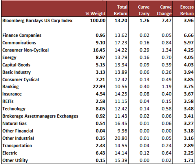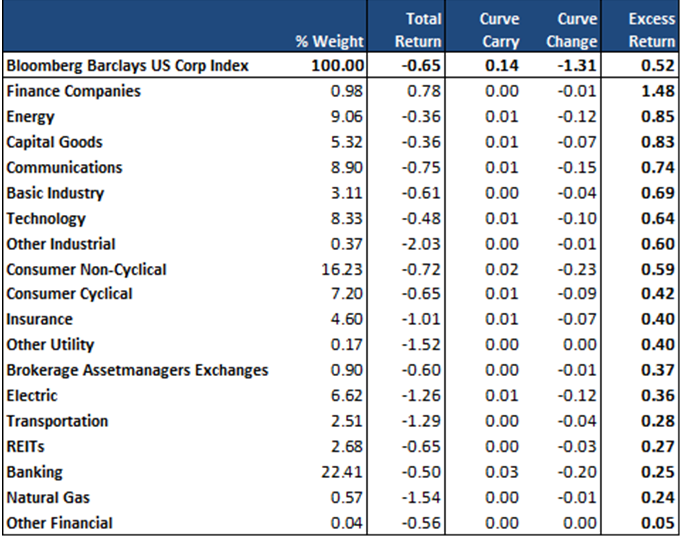 Although Finance Companies (+0.57%) excess returns came out ahead of the Index average in October, it was the first time in recent memory that it was not among the top performers in a positive credit month. The subgroup has been favored by the inclusion of longer-dated legacy GECC paper (GE ‘35s), as well as the rally in Aircraft Lessors throughout the 2nd and 3rd quarters. Renewed Boeing 737 Max concerns diminished spread opportunity were enough to keep that industry at bay. Meanwhile, GE reported positive results late in the quarter, but was not enough to help land FinCos among the top performers yet again.