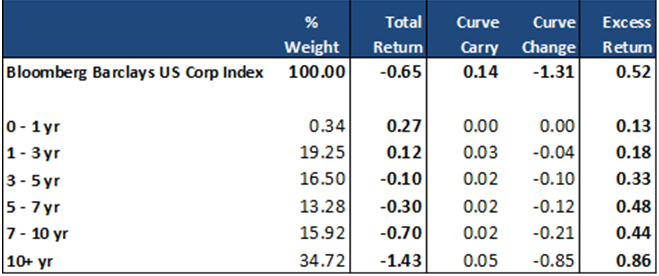 Positive excess return with investment grade credit mostly tighter; rates contributed very little to total return on a round-trip month. Portfolio managers should continue to overweight lower-rated segments with greater risk compensation (OAS), as a flatter yield curve implies global investors will move further out the credit spectrum in USD spread product in an attempt to meet performance hurdles. The consumer non-cyclicals sector (16.3% of IG Index) recommendation is moving to a market weight from an over weight, and basic industry (3.1%) rises to an over weight from a market weight (Exhibit 1).