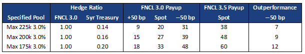 Investors can buy 30-year 3.0% loan balance pools and hedge them 1:1 using FNCL 3.0% TBA. This initially leaves the pay-up unhedged—if rates rise, the pay-up will drop and could eventually approach zero. One solution is to hedge the pay-up using 5-year Treasury notes, using just enough Treasuries compensate for lower pay-ups in a sell-off.
