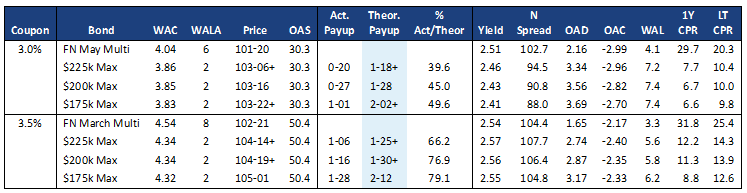 Pools with lower loan balances have better convexity—the loans prepay slower when rates are low and the pool is trading at a premium, and prepay faster when rates are high and the pool is trading at a discount. So these pools offer call protection and extension protection. The average loan size of 3.0% TBA pools is over $300,000 so even a loan with a $225,000 balance has a better prepayment profile than TBA.