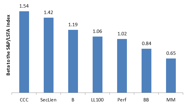 ‘CCC’ loans have the highest beta of 1.54. Second-lien loans are next in line, with a beta of 1.42. This means that if LSTA index returns move down by 100 bp, then ‘CCC’ loans will fall by 154 bp and second-lien loans will fall by only 142 bp. ‘B’ loans have a beta of 1.19, which is 30% higher than the 0.84 beta of ‘BB’ loans. If the LSTA index drops by 100 bp, then ‘B’ will drop by 119 bp and ‘BB’ will drop by only 84 bp.