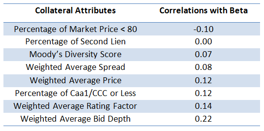 Beta may be a better measure of market risk than the loan attributes many investors use to evaluate CLO loan portfolios. CLOs report every month on a set of collateral attributes including weighted average price, weighted average spread, weighted average rating factor and percentage of second liens, among other things. These attributes offer a valuable snapshot of risks of a CLO deal.  However, the correlation between these attributes and beta is surprisingly low (Exhibit 2).