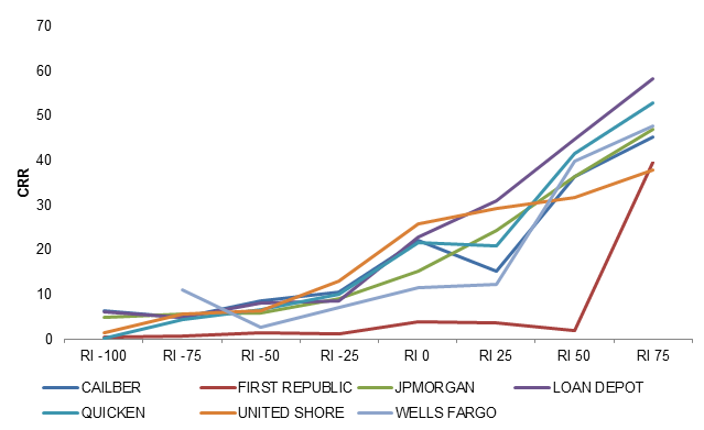 Based on this methodology, First Republic has the flattest S-curve or responsiveness to refinancing incentive. The First Republic s-curve steepens materially given 75 bp of incentive, however this is on a relatively small sample of loans, which may lead to some idiosyncratic observations. Other bank originators like JP Morgan and Wells Fargo demonstrate relatively similar responsiveness to refinancing incentive while certain non- bank originators like Quicken and Loan Depot appear to be modestly faster than bank servicers. United Shore appears to have a flatter S-curve than other non-bank servicers and faster prepayment speeds may be largely a function of higher WACs and greater incentive than other slower paying originators in the same pool (Exhibit 3).