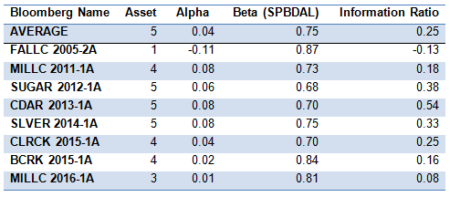Note: Calculations only include deals with at least 18 months of return data considered accurate based on APS screening. Asset number represents quintile of performance with 5 representing the top 20% and 1 the bottom 20%. Alpha, beta and information ratio calculated against the S&P/LSTA Index. For full details on methods, contact your APS representative. Source: Amherst Pierpont Securities as of 11/20/2019.