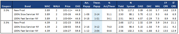 New York loans typically prepay slowly when interest rates fall thanks to high closing costs. The state, counties and municipalities all charge a tax to record a new mortgage, and other closing costs tend to be higher than the rest of the country. Even the fastest servicers’ loans prepay much slower than a typical TBA pool. Theoretical pay-ups on those pools should range from $1-21 to $2-04 and are more likely to be found at a significant discount to theoretical since many investors will avoid servicers known to prepay quickly. Those pools could be a good opportunity to find inexpensive call protection.