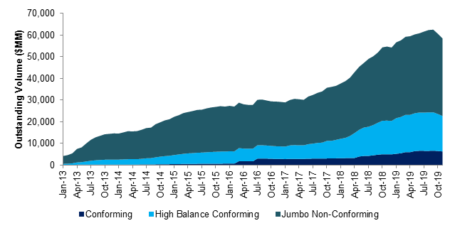 Provident’s PFMT 2019-1 ‘represents a milestone in post-crisis, private label securitization as it is the first transaction to contain 100% agency eligible mortgage loans, none of which are investor purpose,’ according to KBRA’s pre-sale report. While the deal is the first of its kind, the securitization of agency eligible loans in post-crisis PLS is by no means novel. Agency eligible loans have made a meaningful contribution to post-crisis issuance. Currently, regular conforming and high balance conforming loans make up nearly 40% the outstanding volume of post-crisis private label issuance. Regular conforming loans make up just over 10% of outstanding balances, while high balance loans, which are capped at 150% of the national conforming loan limit, make up approximately another 28% of the outstanding universe. (Exhibit 1)