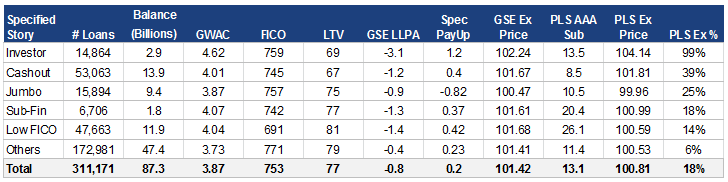 Prior to this transaction, agency-eligible loans have been flowing into private label deals because of a best execution advantage. Looking at September’s total GSE production, nearly all the investor loans pooled by the agencies show a better estimated execution in PLS, while roughly 40% of cash out refinancings and 25% of jumbo loans would have had better PLS execution (Exhibit 5). In reality, jumbo pass-throughs trade much tighter than our pricing assumption, which would skew more conforming high balance production into PLS.