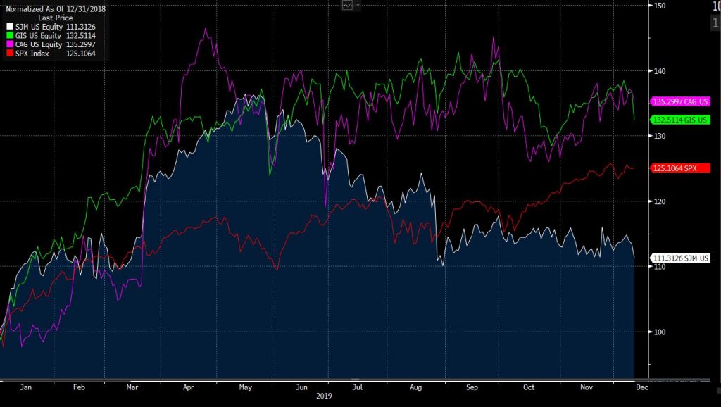 The equity market has seemingly overlooked the net sales underperformance of both GIS and CAG as they have outperformed the SPX year to date. Only when SJM revised full year guidance downward did it start to underperform the SPX. SJM’s stock rebounded after fiscal 1Q20, and looked set to outpace the SPX until it revised guidance for second time.