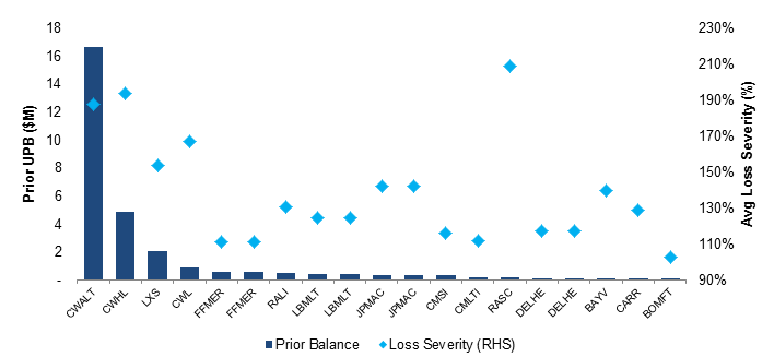 Among legacy loans from New York that left private MBS trusts in December with greater than a 100% loss severity, a disproportionate amount of came from Countrywide trusts. Countrywide liquidations totaled slightly more than $22 million with an average loss severity of 188% while New York loans liquidated in the rest of the legacy universe totaled just $6.2 million with an average severity of 135% (Exhibit 1)