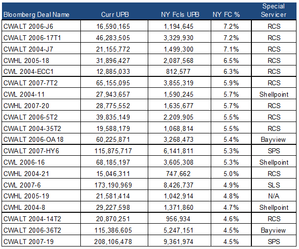 It’s difficult to say with certainty what the exposure may be for a couple of reasons. First, there is no absolute cap on what the loss severity on a given loan can be as it is a function of what the recovery, if any, on the property is plus any costs incurred in liquidation as well as advances that need to be reimbursed to the servicer. In the case where there is a charge-off or expungement of the lien, there is no potential recovery of principal and the trust incurs any additional losses associated with servicer reimbursement. Additionally, according to the terms of the Countrywide RMBS settlement, loans deemed ‘high risk’ are transferred to special servicing with each trust having a specific special servicer assigned to it. Different special servicers may be handling New York loans in foreclosure differently and potential charge-offs associated with the statute of limitations on foreclosures may not be uniform across all special servicers. Adding additional complexity, subsequent to the settlement, one of the six initially named servicers, RCS, is out of business, and information about where that special servicing was transferred is difficult to ascertain.