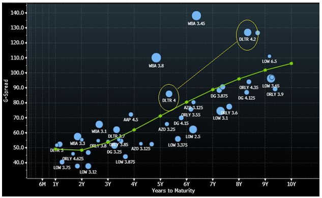 The Dollar Tree (DLTR) debt curve is steep relative to peers, offering an attractive opportunity for IG investors to pick up additional yield. The 4.2% 5/15/28 bonds look particularly attractive on a g-spread basis, trading roughly 41 bp wide to the 4.0% 5/15/25 bonds – a curve that was only 15 bp at issue. Since then DLTR has reduced debt, improved its leverage metric by over a turn, and repaid all senior secured debt. Dollar General’s (DG – Baa2/BBB) 2025-2028 curve, DLTR’s closest peer, is currently only worth 17 bp.