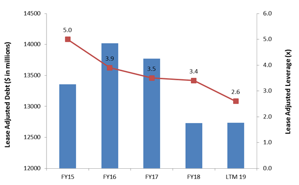 Exhibit 2: DLTR lease adjusted debt and leverage (FY15 – LTM19)