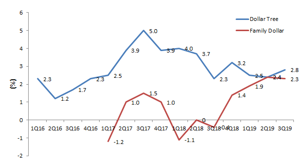 DLTR initiated a store optimization program in 2019 known has H2 for the Family Dollar banner, with a remodel target of roughly 1,000 stores for the year. The new H2 model has better shopping adjacencies, more productive end-caps and a greater number of freezers and coolers to provide for a greater offering of consumables. Furthermore, the model has improved merchandise offerings by including Dollar Tree $1.00 merchandise throughout the store. Management planned for the closing of 390 underperforming stores and the re-bannering of roughly 200 Family Dollar stores to Dollar Tree. The store optimization initiatives have largely been successful as management noted it is driving increased loyalty, repeat visits and improved value perception. As such, management noted that Family Dollar H2 “control” stores were witnessing greater than 10% same-store sales (SSS) growth. This improved overall SSS at the Family Dollar banner which has now posted four consecutive quarters of SSS growth, and an average SSS growth of 2.0% on a last twelve month’s (LTM) basis (Exhibit 3). Additionally, Family Dollar has been witnessing solid performance in its consumables business having posted its 12th consecutive quarter of positive SSS. Management noted that with the format being so successful, they plan to renovate another 1,000 Family Dollar stores to the H2 format in 2020.