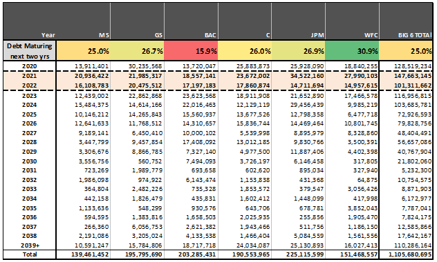 Exhibit 2. Big 6 bank maturity schedules – BAC has the least debt maturing over the next two years, and could therefore have the most limited supply over the next several quarters; WFC has the most maturities over the same period.