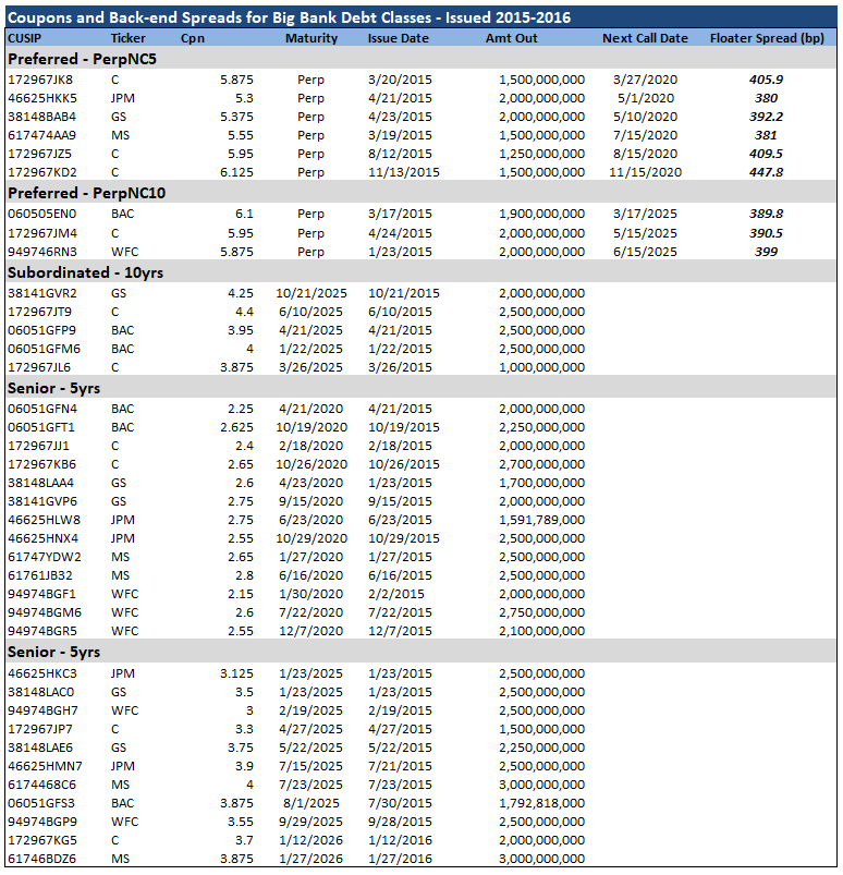For an extended period of time, preferred issuance largely adhered to an unwritten bogey for the back-end of callable no-call 5-year fix-to-float structures of roughly >375 bp (+3M Libor). As appetite for yield increased and spreads tightened, that bogey moved through 350 bp to 325 bp, and is now at levels even inside of <300. The January no-call 5-year perpetual preferred deals were priced with back-end rates as follows: