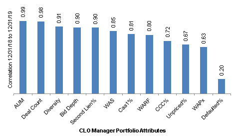 In general, correlations from the end of 2018 to the end of 2019 look high (Exhibit 1). The correlations of nearly 1.00 for AUM and deal count just say that relatively bigger managers remain big a year later and smaller managers remain small. The strong correlations of nearly 0.90 for diversity score, bid depth and share of second liens also suggests managers stake out relative positions on these attributes and largely maintain them. As for spread, share of ‘Caa1’ and rating factor, correlations also are healthy around 0.80. Only for share of ‘CCC,’ share of unpriced loans and loan price do correlations suggest only modest predictability. And for share of default loans, the level at the end of 2018 predicted almost nothing about the level a year later.