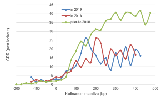 Prepayments in Ginnie Mae project loans could rise a bit higher on average to perhaps 20 CRR, but rates are already so low that the refinance incentive can’t get back to pre-2018 levels of 300 or more basis points (Exhibit 2).