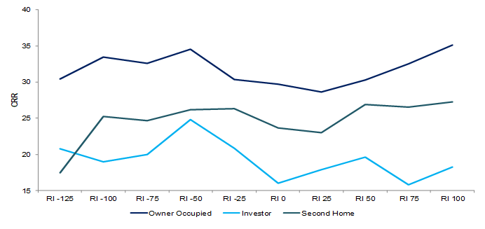 Non-QM deals almost by definition are backed by a mix of loans that fall outside the purview of the QM rules for a host of different reasons. Risk-based pricing on these loans can vary significantly and any prepayment analysis needs to control for a borrower’s propensity to prepay given equivalent refinancing incentives net of any additional spread from risk-based pricing or spread at origination (SATO). After controlling for each loan’s spread over the prime rate at point of origination, the analysis shows that while s-curves are surprisingly flat across owner occupied, investor and second homes in non-QM deals, the absolute level of prepayments is significantly lower in loans backed by investor properties. Higher out-of-the-money speeds in owner occupied loans are likely driven by a larger percentage of borrowers’ whose credit has cured since origination, potentially increasing their refinancing incentive absent a move in interest rates. This phenomenon seems less prevalent in loans backed by investor properties. (Exhibit 1)
