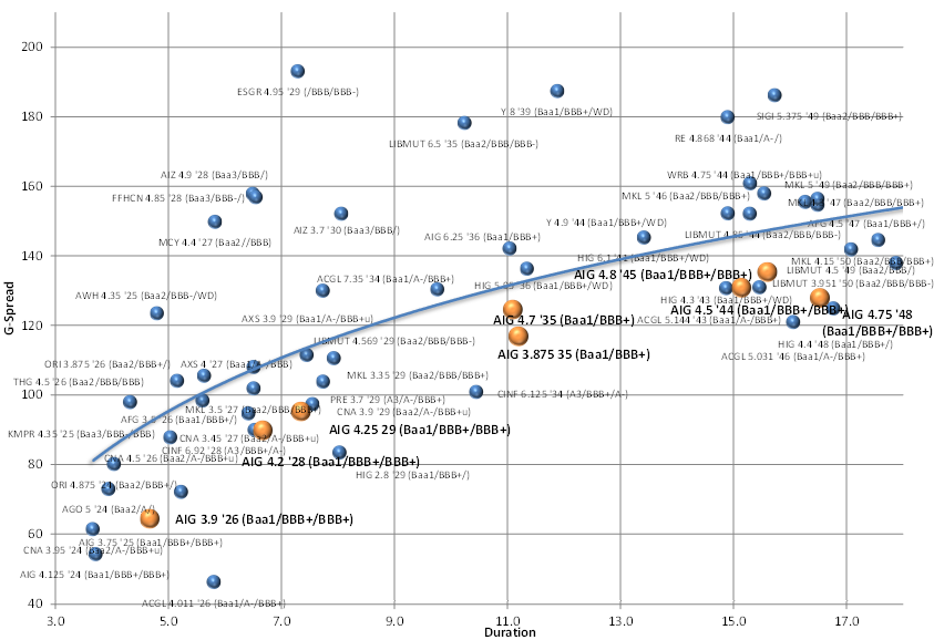 Bottom-line: Prior to yesterday’s recovery, AIG bonds have produced -1.54% excess return year-to-date. That compares with the top-20 issuer excess return of +12.1% (+20.4% total return) generated in F2019. Similarly, BHF bonds had generated -1.38% year-to-date excess returns prior to yesterday’s price move, compared with a top-5 issuer excess return of +16.3% (+26.0% total return) in F2019. AIG long bonds recently closed about -5 bp tighter off the local wides. BHF 2027s and 2047s, which we have written about previously (APS Strategy – BHF 30yr), were both about -10 bp tighter over the past two sessions. Investors should continue to position BHF bonds assertively, particularly the long bond 30-years, due to steepness of the issuer curve (Exhibit 1) and absolute levels that still insulate investors to potential longer-term credit downside. AIG bonds (Exhibit 2) are now trading at levels that offer limited near-term upside to the rest of the sector, but represent solid overall yield relative to the broader bank/financial sector. Investors should consider more actively targeting outlier credits within the P&C segment, such as AIZ (‘28s, ‘30s) and FFHCN.