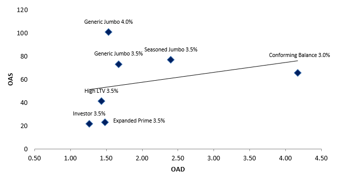 On an option-adjusted basis, 4.0% pass-throughs offer the best risk-adjusted return but monetizing that value may be difficult given the prepayment and premium risk associated with those bonds. Away from higher coupon pass-throughs, seasoned pass-throughs backed by lower WAC pools appear to offer the best risk-adjusted return. Low gross WAC 2018 vintage 3.5% pass-throughs are currently trading at roughly 16/32 behind UMBS 3.5%, roughly on top of the spread at which conforming jumbo specified pools with comparable WACs and seasoning trade in the specified pool market trade. While these bonds appear tight relative to agencies, they should offer significantly better convexity than new issue 3.5% with higher WACs that trade at a mere 8/32 concession to seasoned lower WAC paper (Exhibit 2).