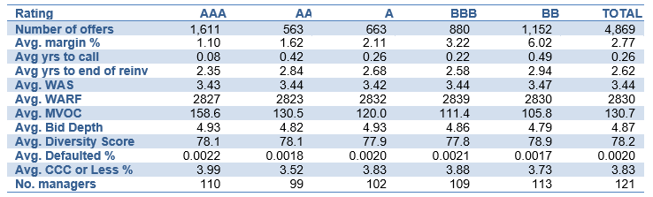Managers who deliver consistently better returns over the broad loan market, adjusted for risk, warrant tighter spreads. If return on the loan market overall is 1%, and a manager’s return during the same period is 1.5%, then the manager’s excess return, also known as alpha, is 0.5%. If this manager only occasionally outperforms the market to achieve positive alpha, rather than creating steady alpha across time, then its alpha adjusted for volatility is low. Steady producers of excess return clearly produce a steady stream of earnings to equity. To the extent return comes from loan price, a steady manager also outperforms peers on MVOC, helping the performance of speculative grade CLO debt. Even investors in ‘AAA’ debt have exposure to the performance of the underlying loan portfolio.