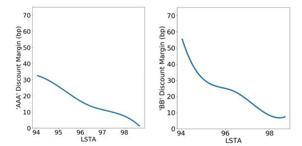 Easier pricing also should make scenario analysis and CLO hedging easier. This is especially valuable as loan prices move and MVOC and leverage on CLO classes change. CLOs are notoriously difficult to hedge and show low correlation with a wide range of potential offsetting instruments. But the strongly nonlinear relationship between leverage and spread arguably explains the low correlation. Correlation only works for linear relationships. CLOs, especially ones with MVOC below 110, should be delta-hedged—the hedge getting reset as MVOC moves. But that is work still to be done.